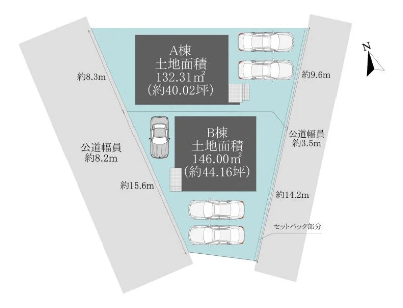 二方(除角地) 南東 間口14.2m 公道 幅3.5m 南西 間口15.6m 公道 幅8.2m |