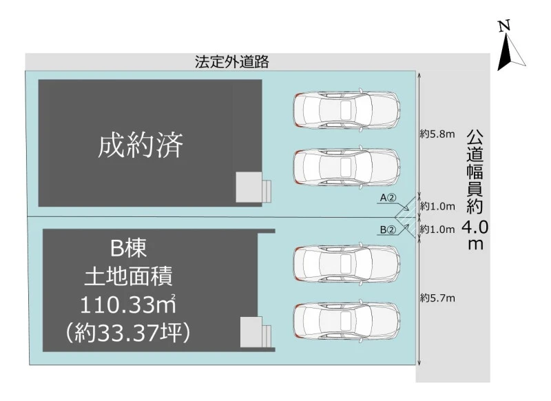 | 諸条件・相談 | ■土地家屋調査士・司法書士は売主指定■A②、B②はA棟B棟にて共同利用の覚書を締結予定(建築物の設置、駐車、駐輪は一切不可)■地目:畑※引渡時までに売主にて「宅地」へ変更予定 | ||